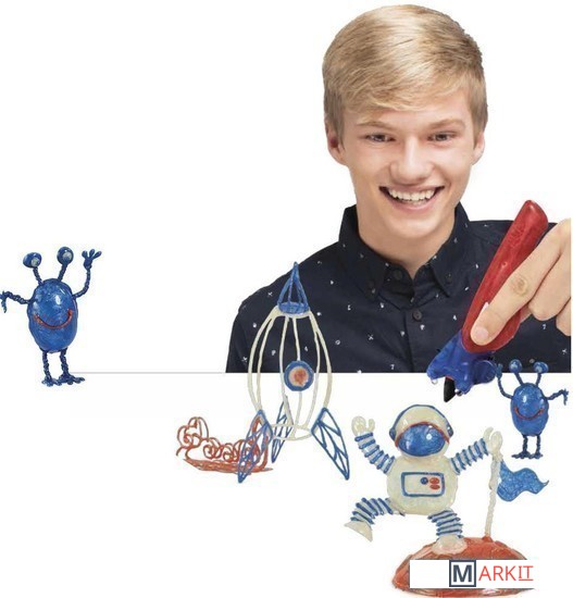 В набор для рисования входят 3 3D ручки трёх цветов с металлизированной пастой Metallic (красный, белый, синий) со съемной световой насадкой для отверждения. При помощи высококачественной пасты с эффектом металлик мальчик может создать отличные замысловатые фигурки и космические корабли.