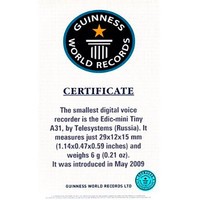 EDIC-mini Tiny + А77 имеет экстремально малые размеры (29*15*12 мм), вес всего 7 грамм.Это самый маленький диктофон в мире, способный вести непрерывную аудиозапись от встроенного аккумулятора более двух суток.